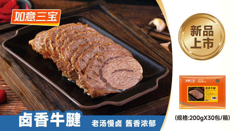 2024年3月,专业从事速冻肉类食品研发、生产和营销的如意三宝品牌,发布了6款新品,大厨特调卤水配方的酱香系列三款产品,酱香牛腱、酱香牛力骨、酱香牛肉,品牌王牌单品延展的蒜香扇子骨、黑椒牛仔骨,以及大众认知度非常高的凉菜产品凉拌牛肚丝。
