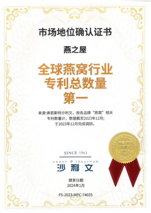 从食品安全到健康饮食,社会经济发展水平的提升让人民群众更加注重食品品质。会上,中国工程院院士、江南大学校长陈卫在专题报告中强调,不仅要推动食品产业的创新,更要在提升食品营养价值、满足公众健康需求方面发挥关键作用。2012年,燕之屋在传统燕窝滋补产品的基础上,创新推出打开就能吃的“碗燕”,解决燕窝炖煮烦恼,开启即食燕窝润养新时代。多年来,燕之屋通过创新科研不断升级燕窝产品炖煮技术,打造更健康、更营养、更美味的高品质燕窝,以产品力印证卓越科研实力。截止至2024年6月5日,燕之屋拥有国内外授权有效专利141项专利,其中发明专利23项,实用新型专利63项,外观设计专利55项。研究院发表论文53篇,其中SCI论文16篇,专著2部。经知名咨询机构弗若斯特沙利文有限公司认证,截至2023年12月,燕之屋在全球燕窝行业专利总数量第一、自主发明专利数量第一。