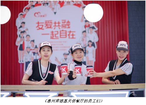 广东肯德基为消费者提供更多创新口味和自在体验的同时,高度重视企业社会责任,并致力于以爱回馈社区、持续助力社区发展。2021年广东肯德基与惠州慈云图书馆跨界合作,携手开展“同声童阅”儿童公益项目,并在隆生金山湖中心肯德基建立“肯德基声阅推广基地”,为少年儿童提供有声故事与趣味图书,提升儿童的朗读技巧。通过捐赠温暖的声音故事,为小候鸟(留守、流动儿童)送上温暖的陪伴。2022年,惠州首家“天使餐厅”正式启动,通过改进餐厅管理模式、改造设备等,建立共融有爱的工作环境,为残障人士营造无障碍的就业环境,提供平等发展的就业机会;推出“肯德基食物驿站”,向有需要的市民免费分享余量食物,倡导节约粮食,杜绝“舌尖上的浪费”等绿色可持续的消费模式,都是助力社会正能量的可持续输出。