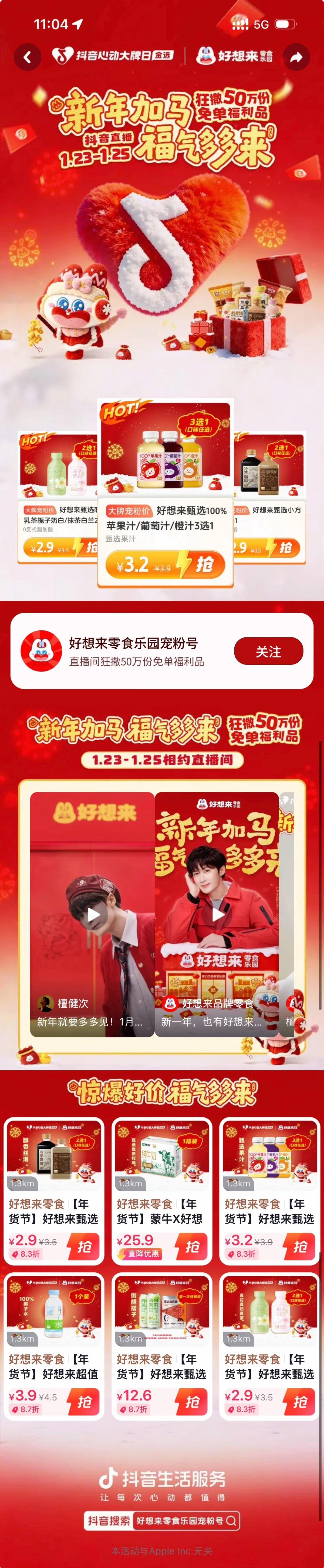 本次“新年加‘码’,福气多多来”活动,是好想来与「抖音心动大牌日」IP的一次深度共创。通过 “实在优惠 + 好玩直播 + 线下惊喜” 的组合拳,成功将一次年货销售,变成了一场有温度、有记忆点的品牌节日。