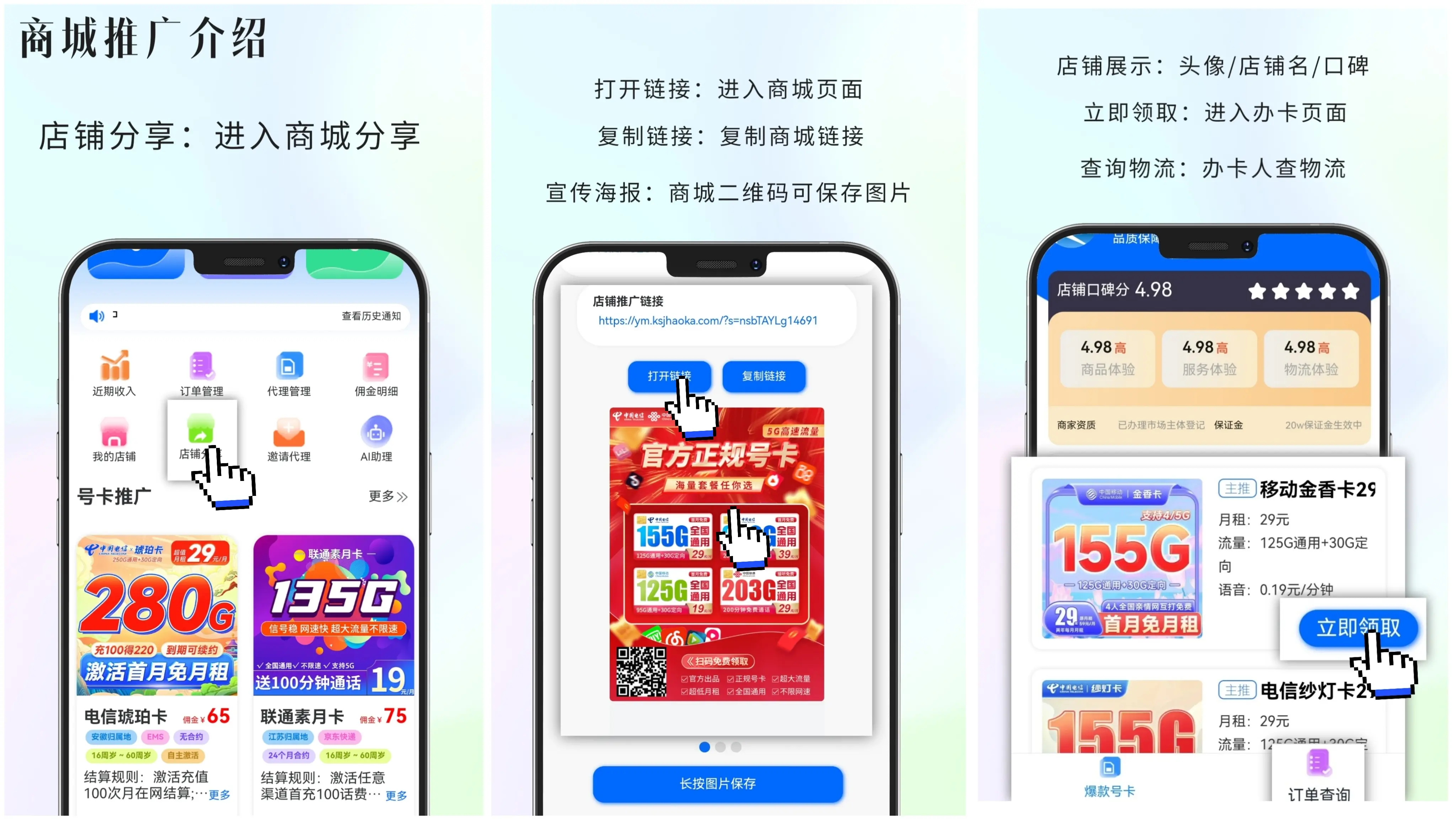 点店铺分享,即可进入号卡推广分享页打开链接,复制链接、一键生成海报、分享办卡页面都可以进入你的办卡商城,办卡自动发货、激活后拿到佣金。