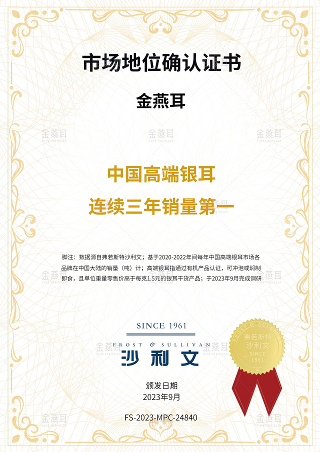 另外,自金燕耳品牌成立后,陆续获得了众多销售荣誉,并于2023年取得了“中国高端银耳连续三年销量第一”的市场认证,成为银耳行业标杆品牌。