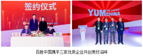 现场,百胜中国与两家中国企业“湖北华贵食品有限公司”、“山东中基食品有限公司”以及一家泰国企业“高豊有限责任公司”分别签署合作意向,百胜中国将携手三家优质企业在源头采购、产品研发等方面开展合作,共创美好滋味。