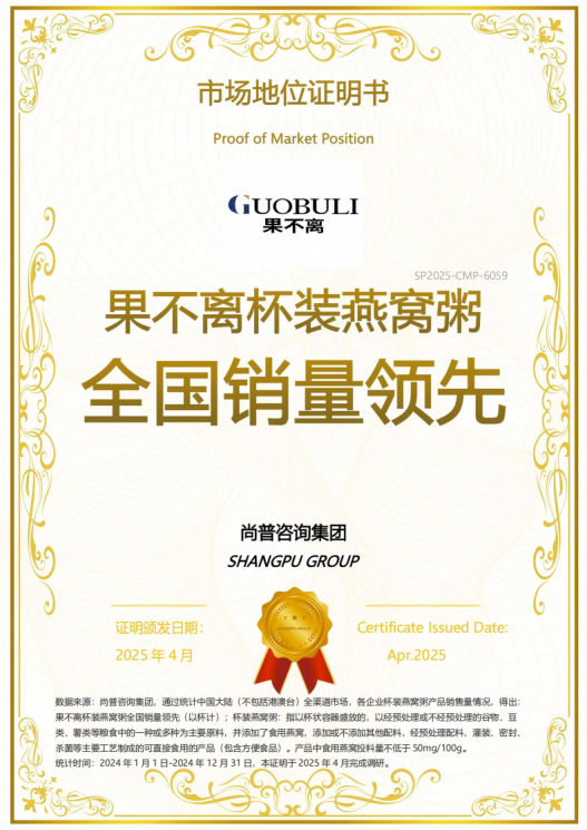 2025年4月,尚普咨询集团有限公司(以下简称“尚普咨询集团”)对杯装燕窝粥市场进行深度调研,经专家和企业调研以及终端销售渠道交叉验证后,给安徽果不离生物科技有限公司颁发了 “杯装燕窝粥上市爆卖20000000杯”,“杯装燕窝粥全国销量领先”的市场地位证书。